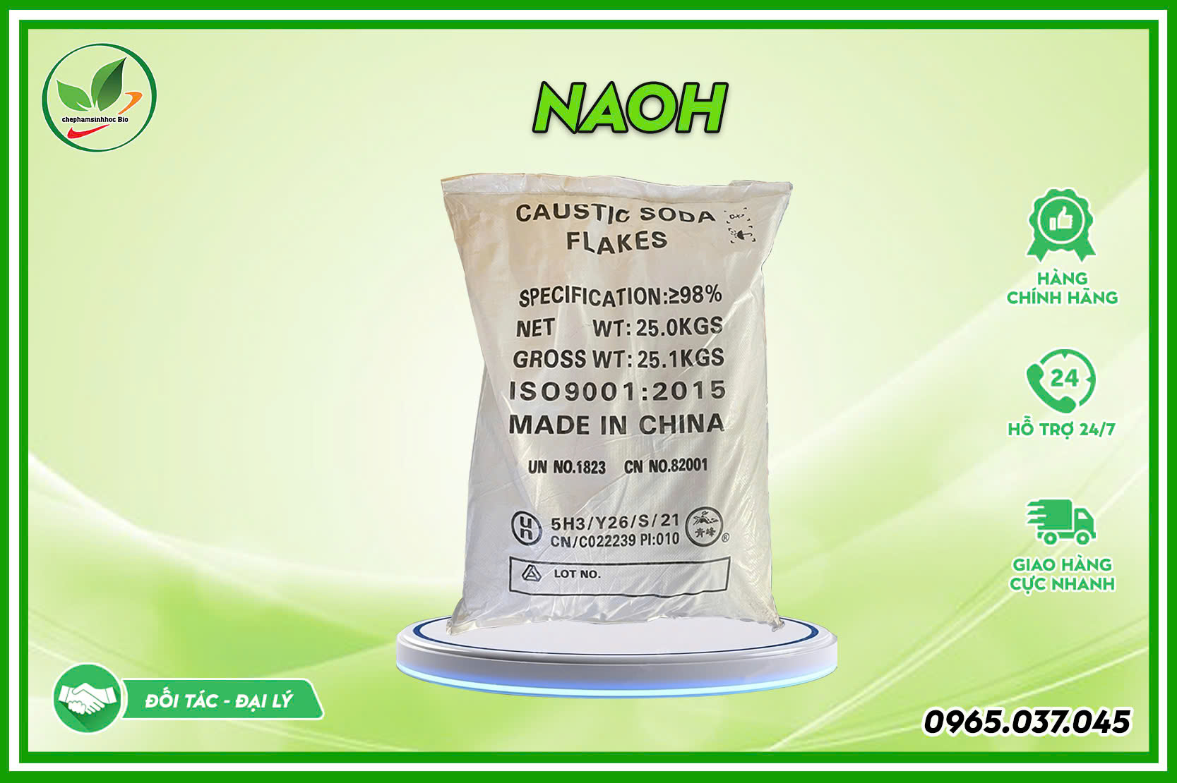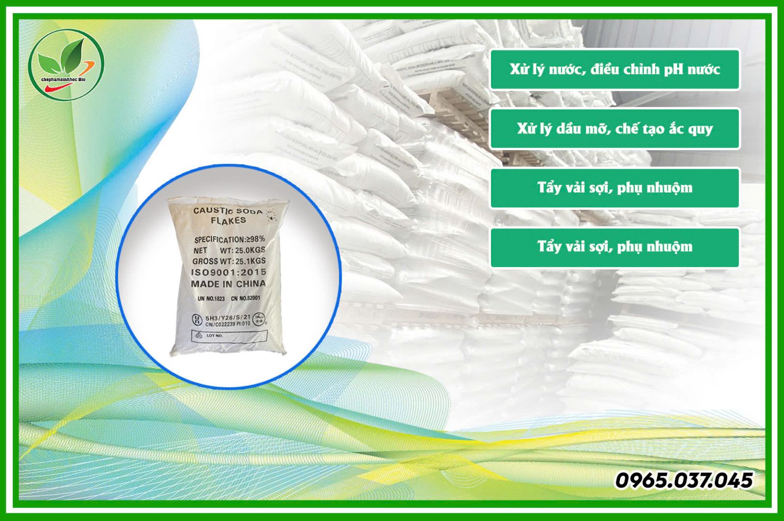 Sodium hydroxide hay Caustic soda, Xút, Natri hydroxit. Là chất rắn không màu dạng vảy hoặc màu trắng, hút ẩm mạnh, tan hoàn toàn trong nước, sinh nhiệt mạnh. Nó tạo thành một bazơ mạnh khi hòa tan trong môi trường nước. CTHH: NaOH, CAS: 1310-73-2, hàm lượng: 99%, xuất xứ: Trung Quốc, quy cách: 25kg/bao. Natri hydroxit ứng dụng trong công nghiệp sản xuất giấy, xà phòng, tẩy trắng vải sợi, xử lý nước, chế biến thực phẩm, dược phẩm, thuốc sâu…